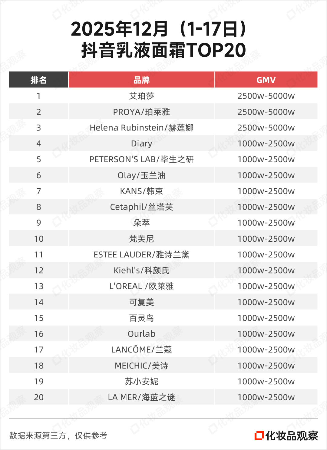 第三方數據顯示,12月至今(12月1日-17日),抖音乳液面霜TOP1被艾珀莎拿下,GMV2500w-5000w,連珀萊雅、赫蓮娜,也只能屈居2、3名。